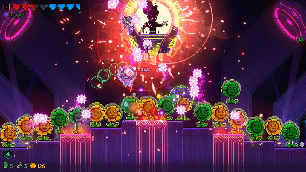 Jako fan jedynki (mam ją na Switchu, przejście zrobione czterokrotnie), poczułem się jak w domu. Neon Abyss 2 oferuje znajomą strukturę pięciu poziomów, bossów stylizowanych na social media i masę przedmiotów, które zmieniają rozgrywkę. Już po pierwszej godzinie miałem na sobie zbroję z emoji, ognistego Hatchimona i karabin strzelający zielonym jadem. Klasyka.